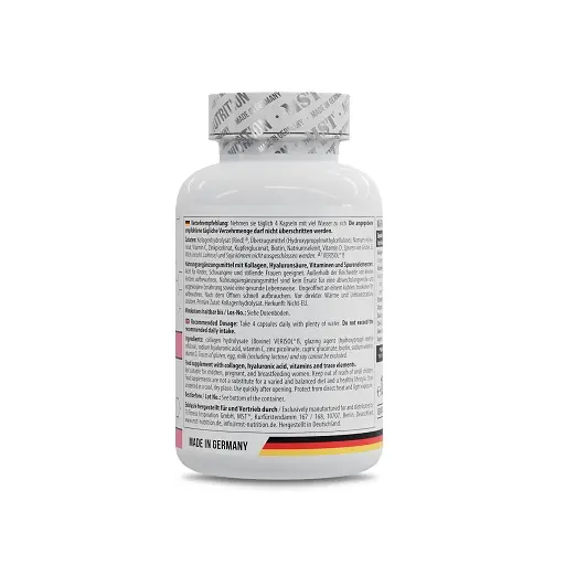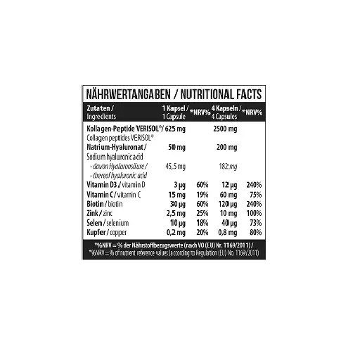 Die Kapseln enthalten unter anderem hydrolysiertes Kollagen (VERISOL®), Natrium-Hyaluronat, Ascorbinsäure (Vitamin C), Zinkbisglycinat, Kupferbisglycinat, Natriumselenit, Cholecalciferol (Vitamin D3) und D-Biotin.