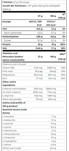 Das Produkt enthält Molkenproteinkonzentrat, Molkenproteinisolat, Kreatin-Monohydrat, L-Arginin, Maca-Wurzelpulver, Vitamin B6, Folsäure, Magnesium und Zink.