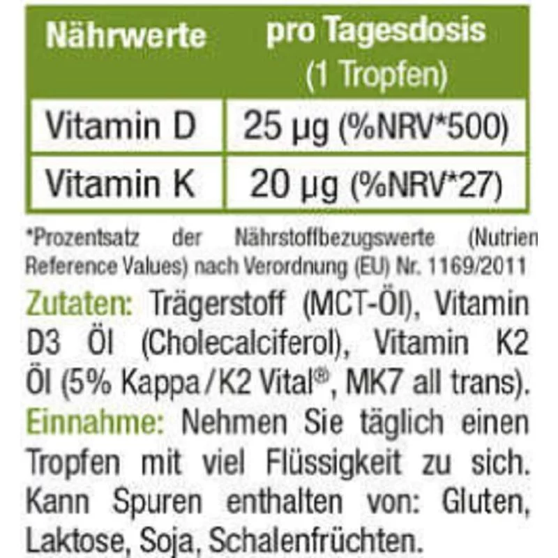 Trägerstoff: MCT-Öl; Vitamin D3 Öl (Cholecalciferol), Vitamin K2 Öl (5% Kappa/K2 Vital®; MK7 all trans)