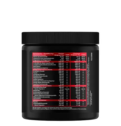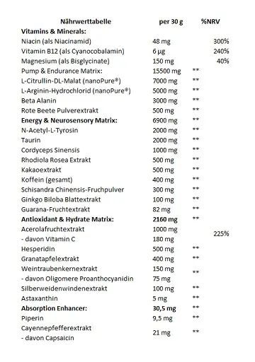 L-Citrullin-DL-Malat 2:1, L-Arginin-Hydrochlorid, Beta-Alanin, N-Acetyl-L-Tyrosin, Taurin, Aromamischung, Magnesiumbisglycinat, Acerolafruchtextrakt (enthält Vitamin C), Cordyceps Sinensis Extrakt, Rhodiola Rosea Extrakt, Astaxanthin (aus Haematococcus pluvialis), Hesperidin (aus Pomeranze), Rote-Bete-Wurzelpulver, Kakaoextrakt (enthält Theobromin), Granatapfelextrakt (50 % Polyphenole), Koffein, Schisandra chinensis-Fruchtpulver, Weintraubenkernextrakt (50 % OPC), Silberweidenrindenextrakt, Ginkgo-biloba-Blattextrakt (24 % Flavonglykoside), Guarana-Fruchtextrakt (12 % Koffein), Süßungsmittel (Sucralose), Nicotinamid, Cayennepfefferextrakt, Schwarzer Pfefferextrakt (95 % Piperin), Cyanocobalamin.